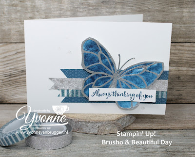 héél mooie kaart voor het KKT, tof om de vlinder met brusho te doen, leuk met de tapejes...